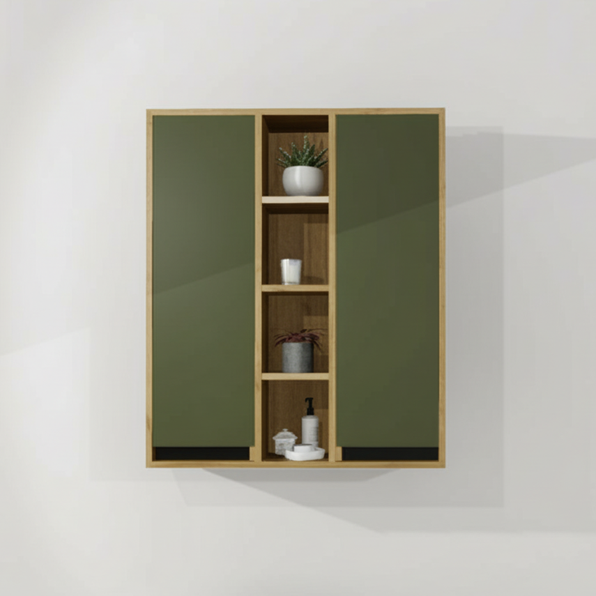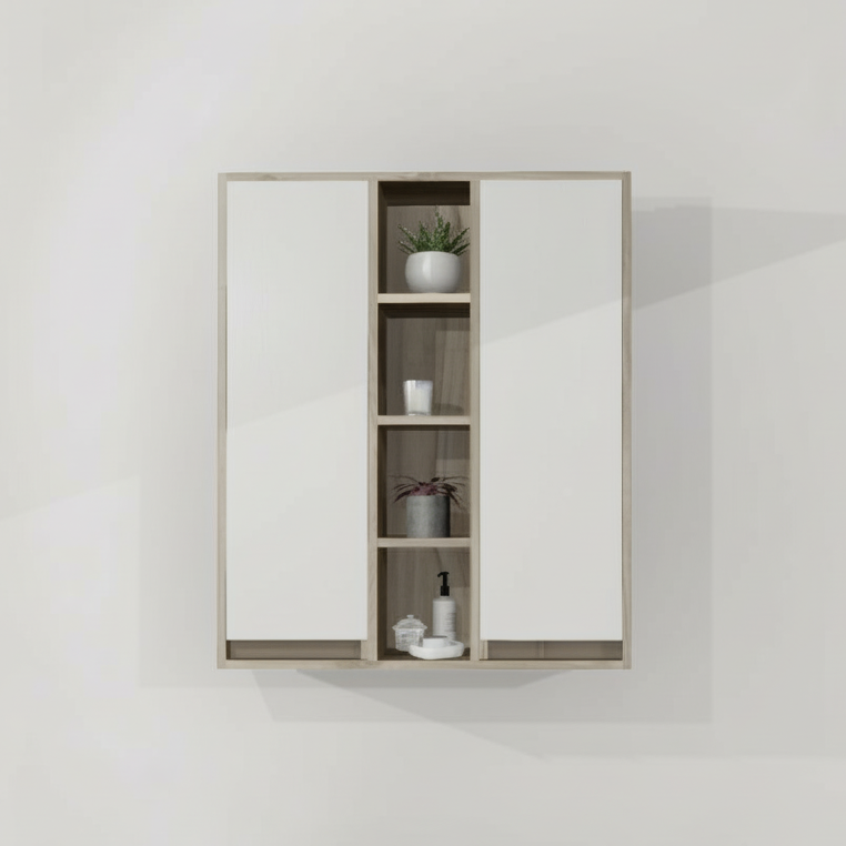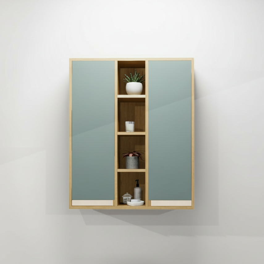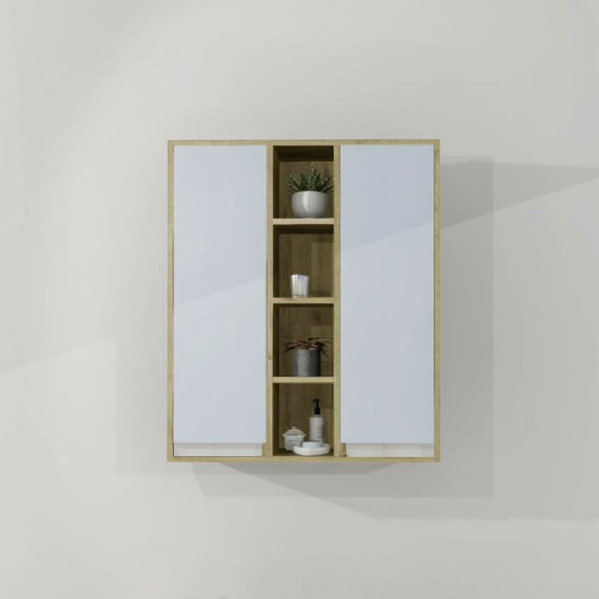 Cette pharmacie en mélamine est conçue d'un caisson 2 portes et une section tablettes ouvertes au centre.