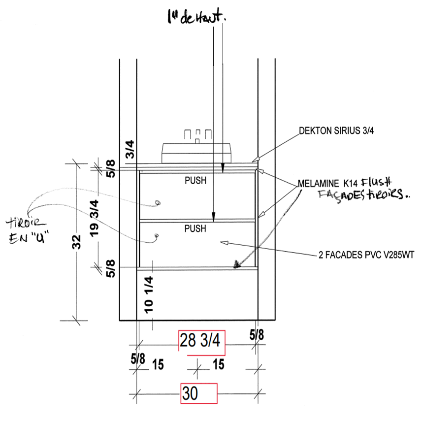Prévoir ajustement des tiroirs en U. modification non inclus.